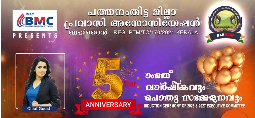 മനാമ: പത്തനംതിട്ട ജില്ലാ പ്രവാസി അസോസിയേഷൻ ബഹ്റൈൻ്റെ (PAPA- Bahrain) 5-ാം വാർഷികാഘോഷവും 2026-27 വർഷത്തെ എക്സിക്യൂട്ടീവ് കമ്മിറ്റിയുടെ സ്ഥാനാരോഹണ ചടങ്ങും 'ഹൃദയപൂർവ്വം പത്തനംതിട്ട 2026' എന്ന പേരിൽ വിപുലമായി ആഘോഷിക്കുന്നു.